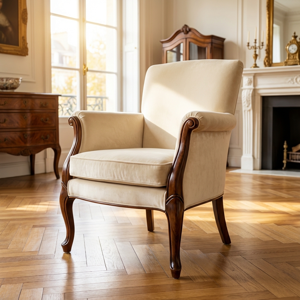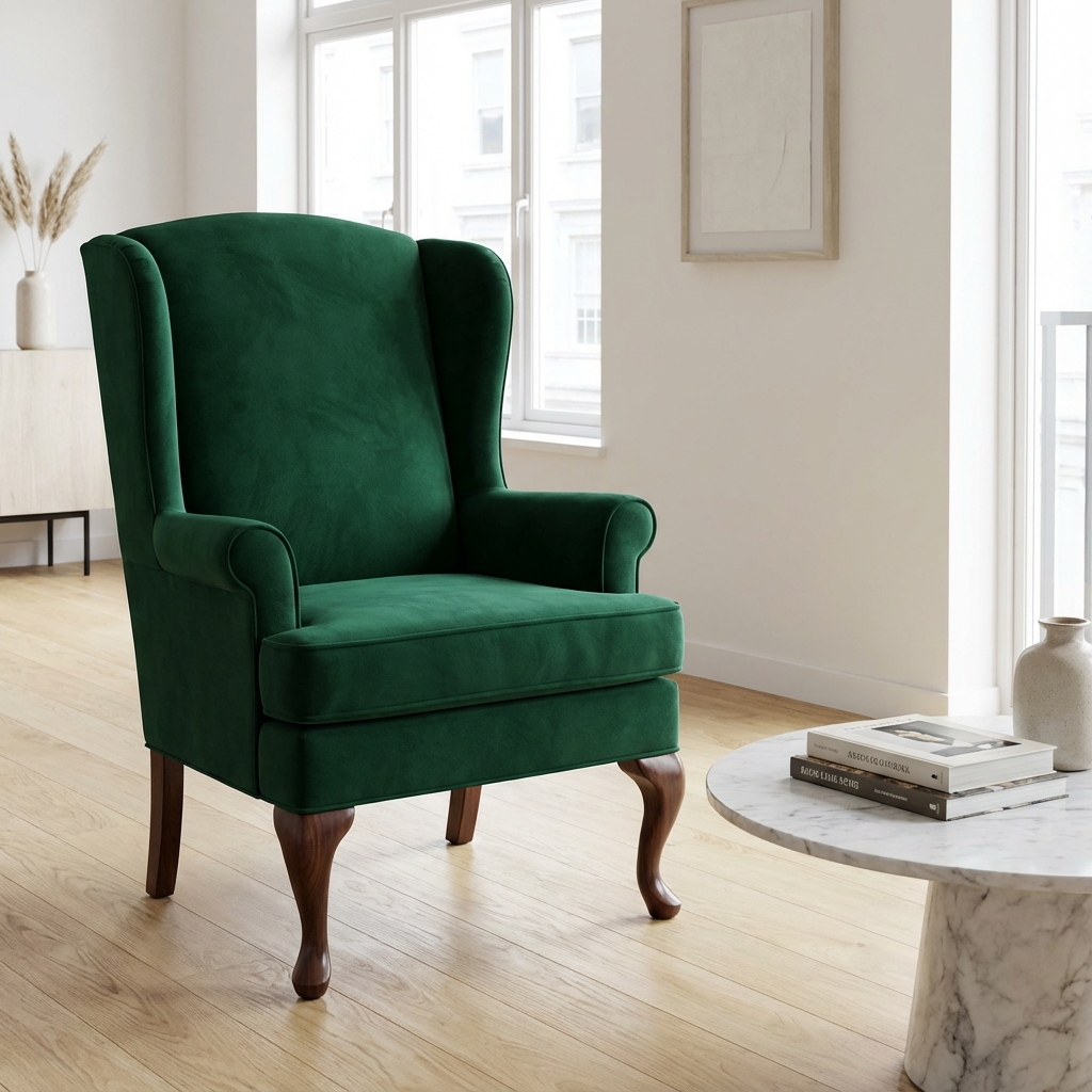 1960'lardan kalma yıpranmış berjer, modern kadife kumaş ve ceviz cila ile salonun yıldızı oldu.