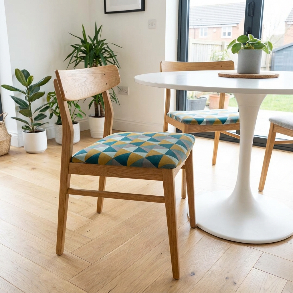 Kırık iskeleti onarıldı, süngeri yenilendi ve geometrik desenli kumaşla modernize edildi.